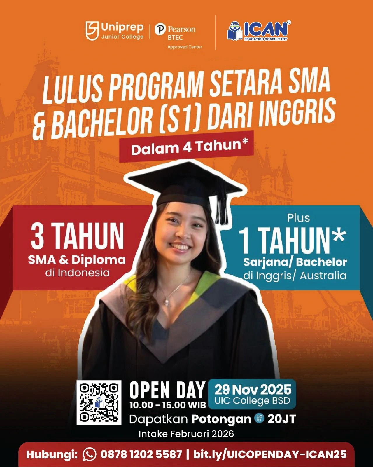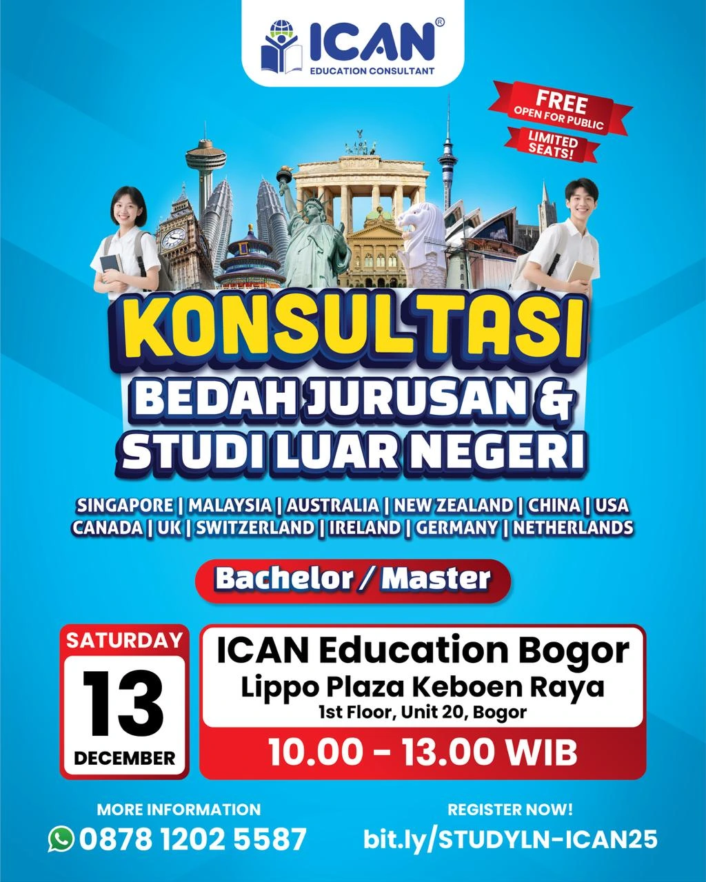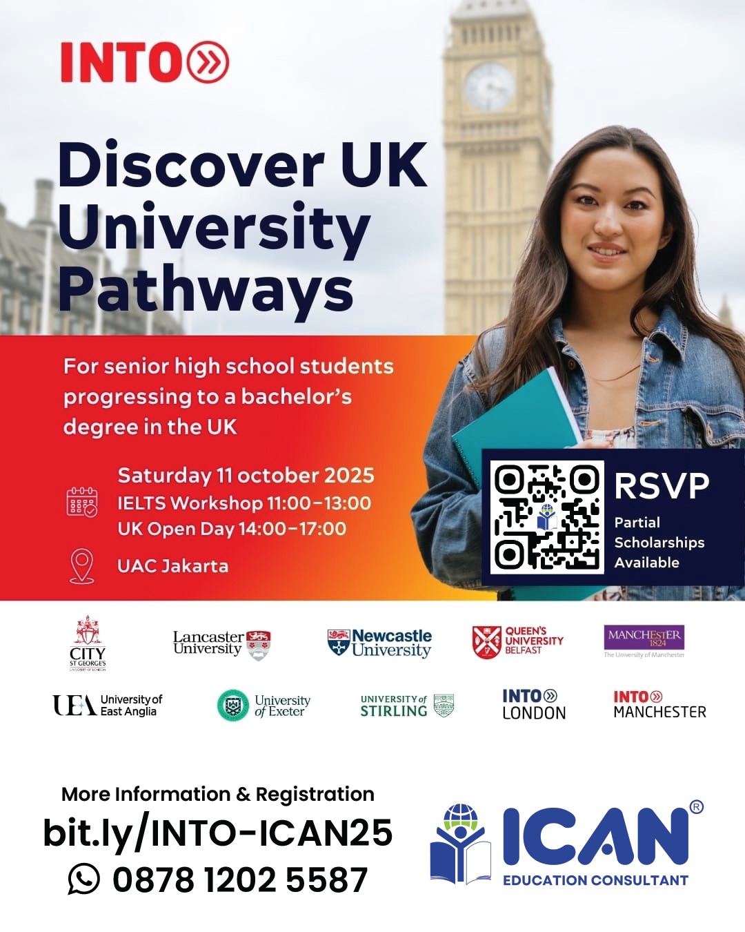 Sudah siap untuk menggapai impianmu menimba ilmu di universitas top luar negeri? Yuk, segera konsultasikan rencana kuliahmu ke luar negeri bersama agen kami di ICAN Education, konsultan dan agen pendidikan profesional terbaik terpercaya di Indonesia. Dengan senang hati kami akan melayani proses kelancaran kuliahmu!