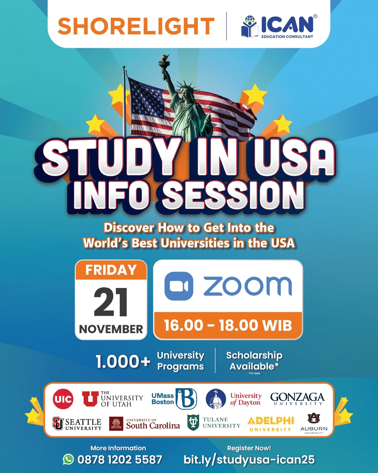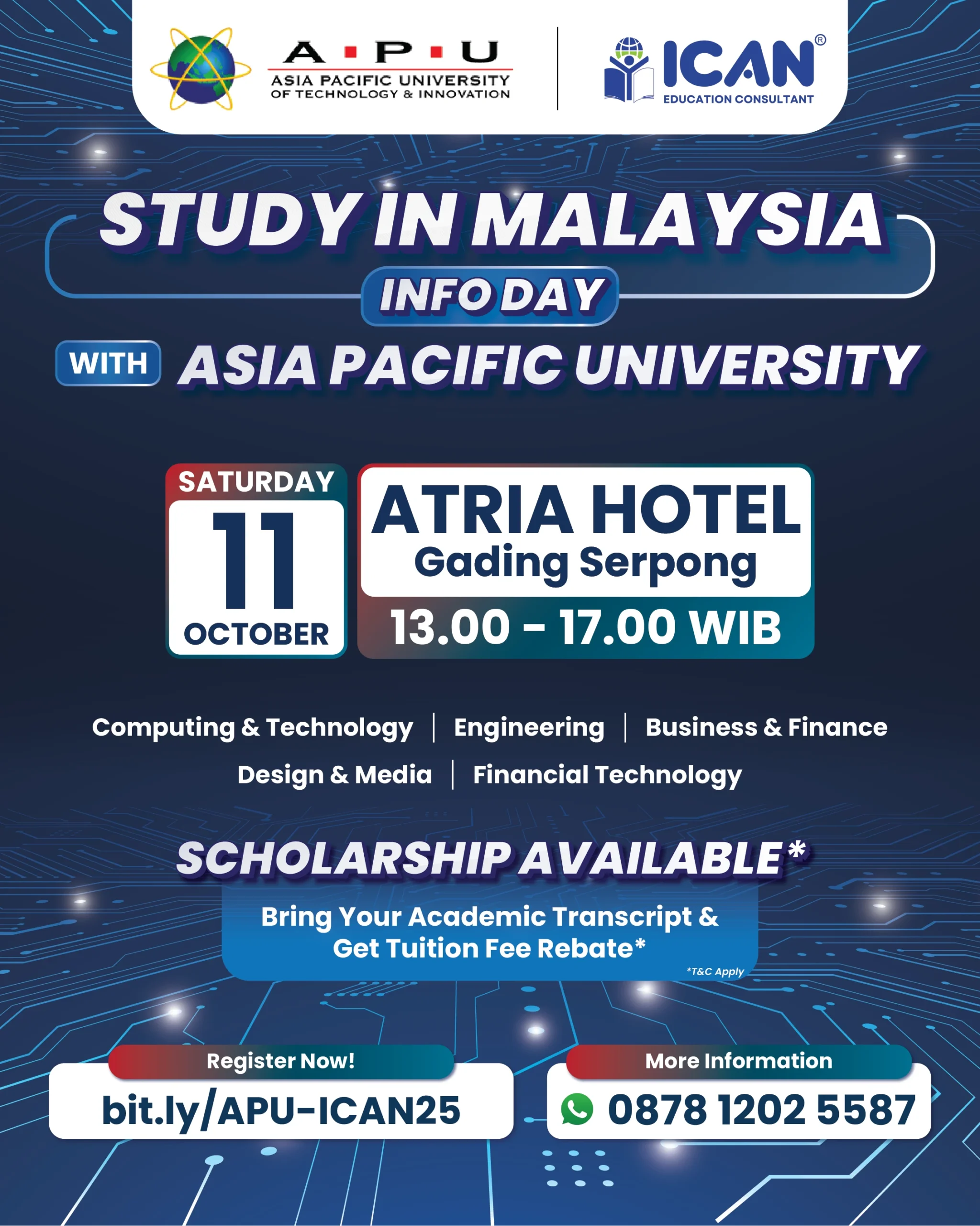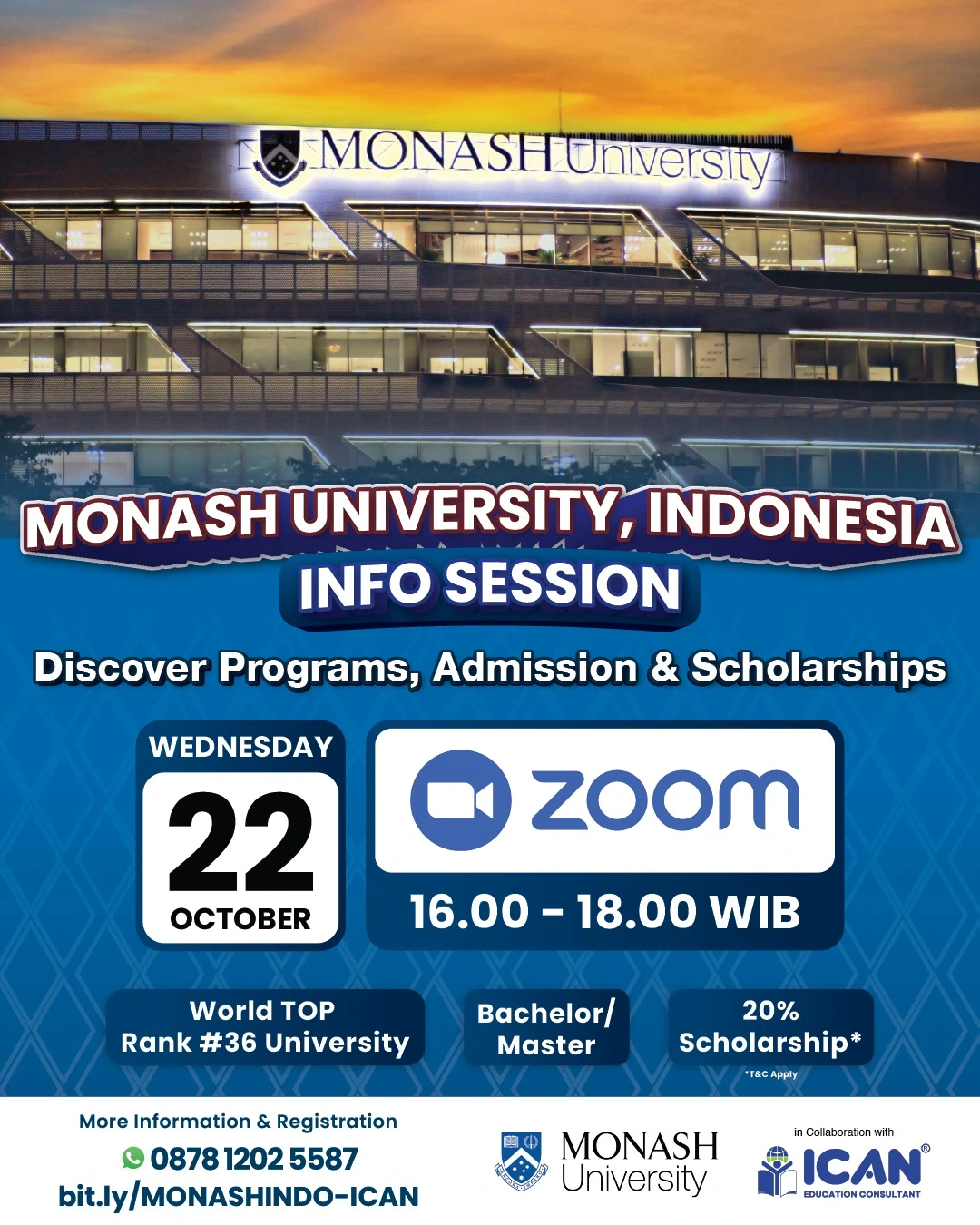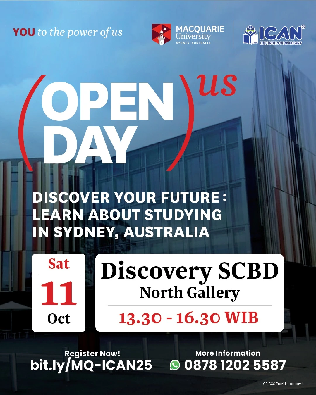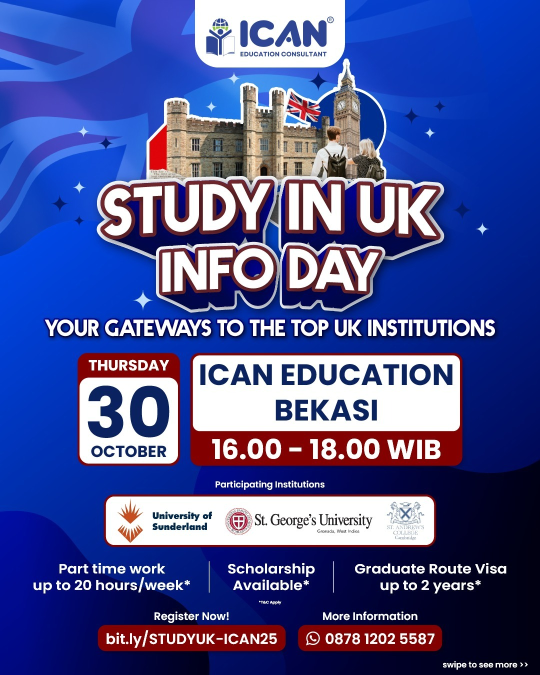 ICAN Education bersama dengan universitas ternama menggelar berbagai acara yang dapat menambah wawasan kamu seputar kuliah ke luar negeri. Mendatangkan langsung para representative universitas, kamu akan lebih mudah mendapatkan informasi terkait universitas yang kamu impikan!